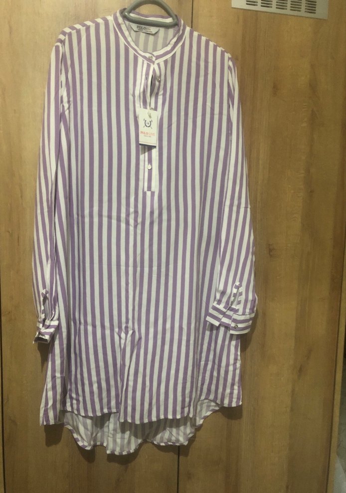 Mor-beyaz çizgili uzun kollu, V yaka, düğmeli manşetli, pamuklu ve bol kesim kadın gömleği. Rahat ve günlük tarz için uygundur.