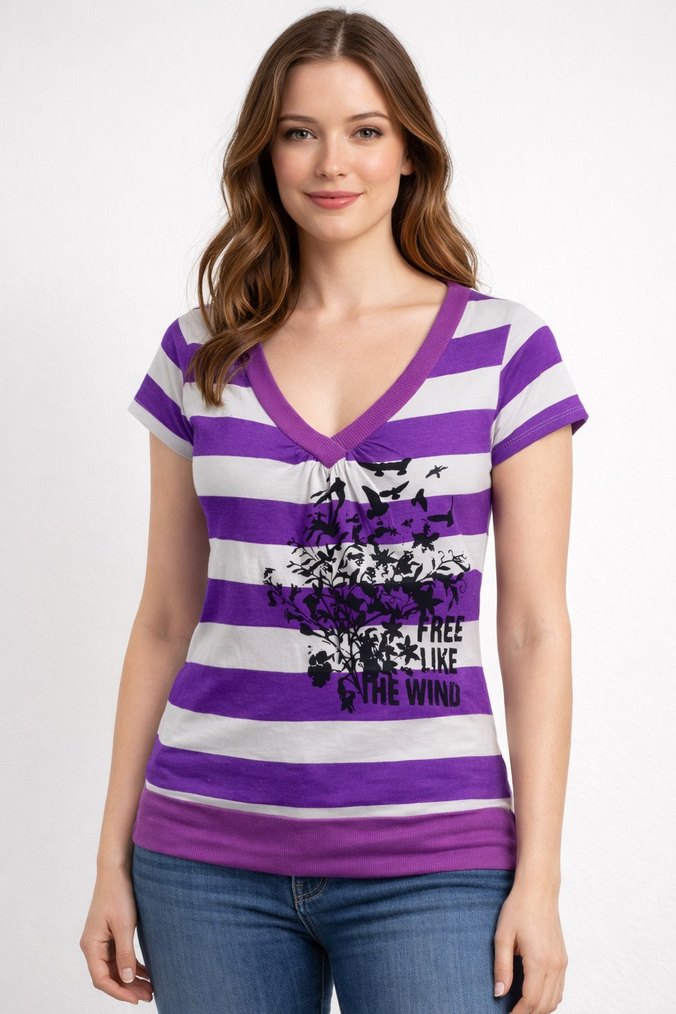 Mor ve gri çizgili, V yakalı, kısa kollu kadın tişörtü. Pamuklu, bol kesim, pileli detaylı ve baskılı, dış mekan için uygun rahat bir model.