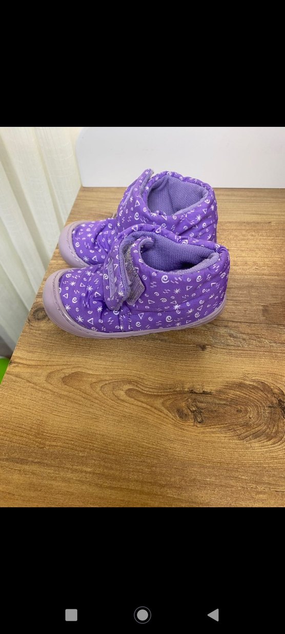 Mor renkli, yumuşak iç yüzeyi ve kauçuk tabanlı kız çocuk ev terliği. Cırt cırtlı ve renkli tie-dye desenli, rahat kreş ev için uygun.
