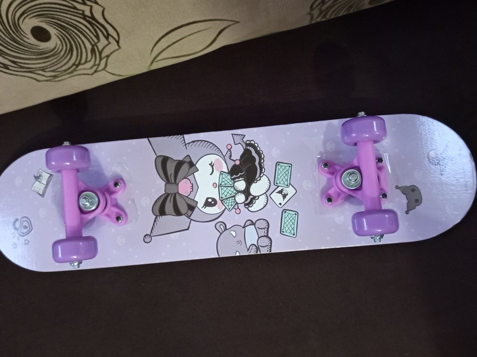 Koyu mor renkte, üzerinde eğlenceli çizgi film figürleri bulunan çocuk kaykay tahtası, sağlam mor tekerleklerle donatılmıştır.