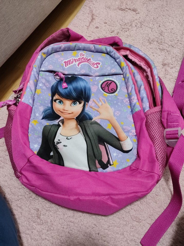Mor çocuk okul çantası, renkli ve çizgi film karakterli ön cepli, çok bölmeli yapıya sahip.