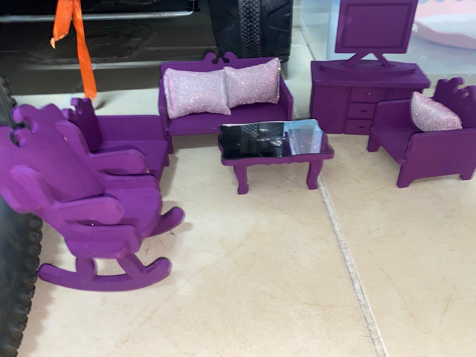 Koyu mor renkte çocuk oyun mobilyası seti, sallanan sandalye, yastıklı kanepe, sehpa ve TV sehpası içerir.