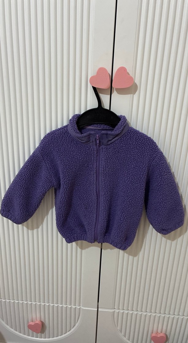 Mor renkli, peluş dokulu, bisiklet yaka ve fermuarlı, çocuklar için yumuşak ve sıcak tutan ceket.