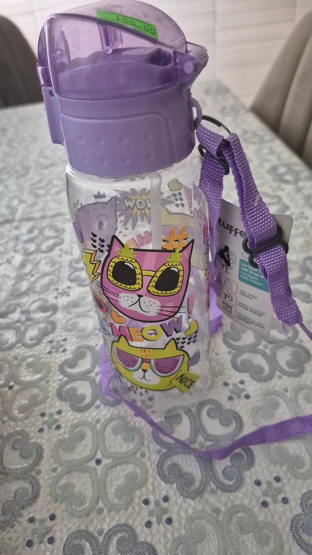 Canlı mor renkte, sevimli kedi desenli çocuk suluk şişesi. Taşıma kayışı ve dökülmeyi önleyen kapaklıdır.