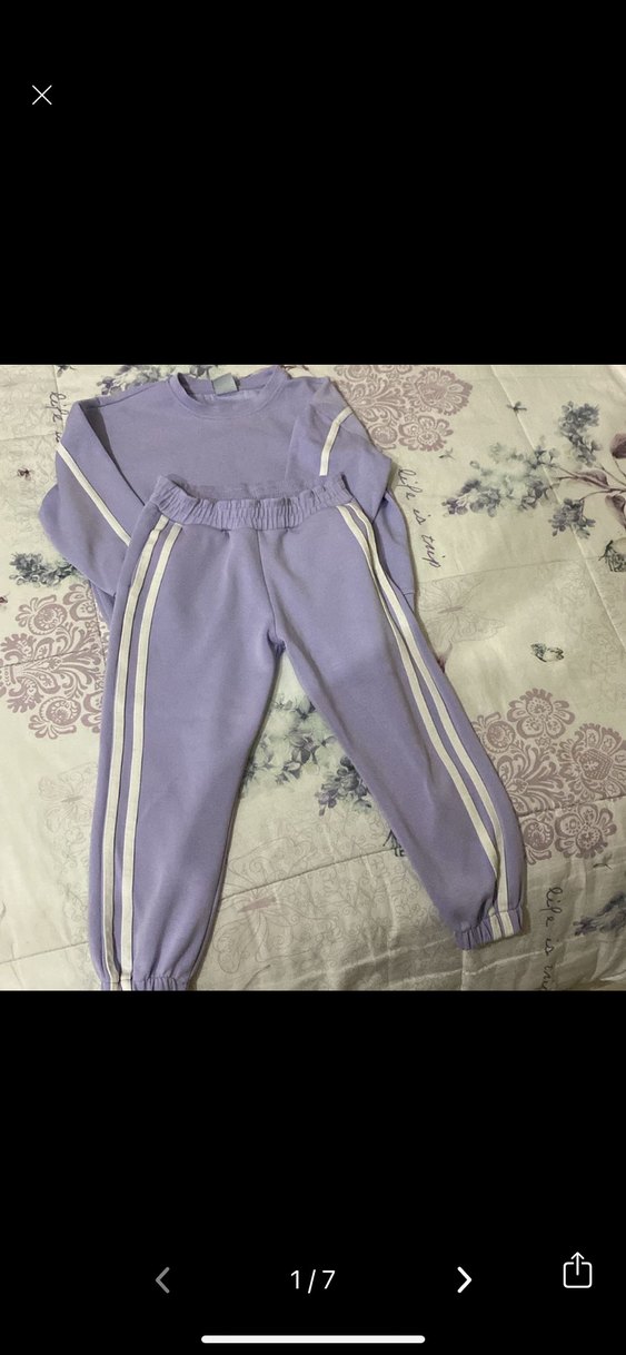 Mor pastel renkli, beyaz şeritli, bol kesim kız eşofman takımı. Yumuşak ve sıcak kumaştan, uzun kollu ve yuvarlak yakalı üst, sağ dizinde ufak bir aşınma var 4/5 yaş için uygundur