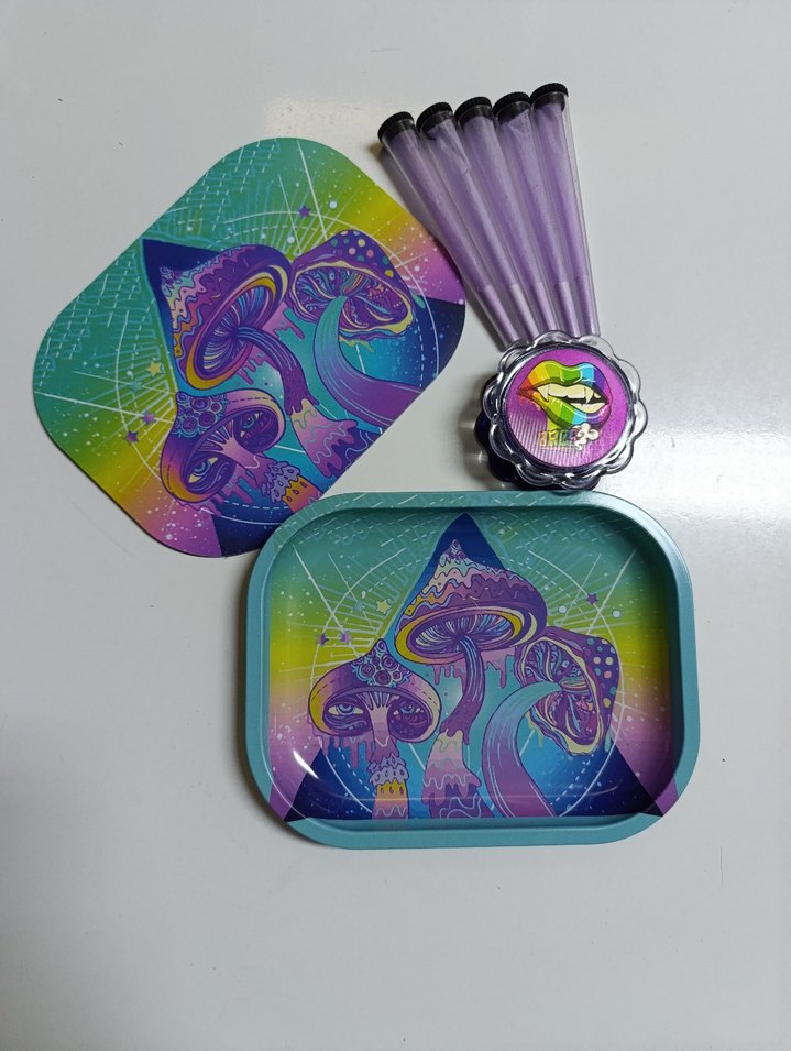 Mor renkte, üzerinde canlı mantar desenleri olan çocuk tabakları ve saydam mor saplı çatal, bıçak seti ️.
