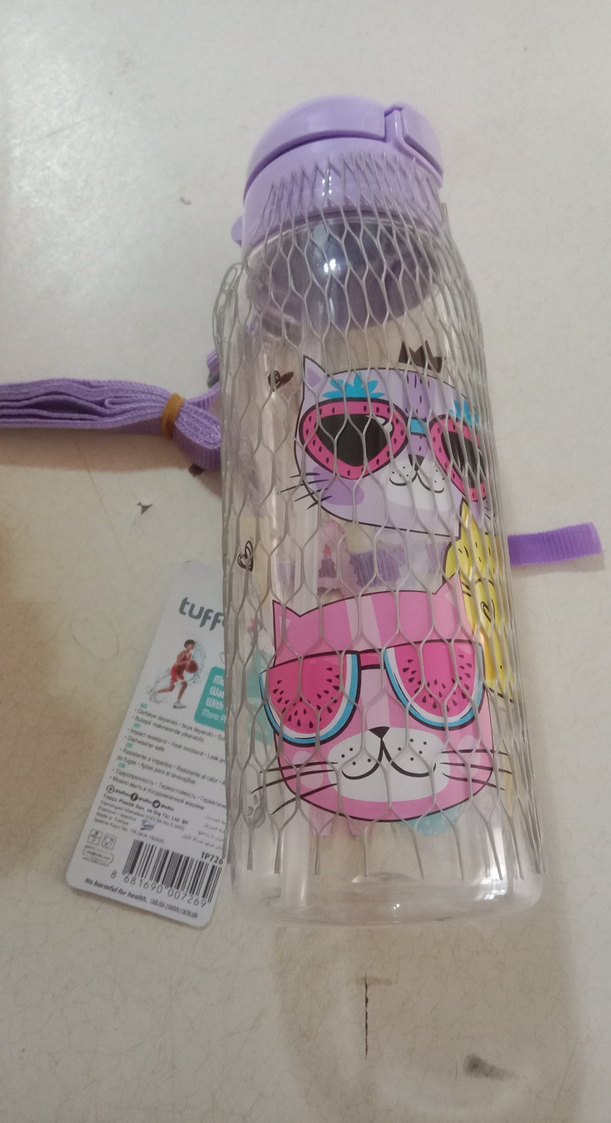 Mor renkli, güneş gözlüğü takan kedi desenli çocuk termos şişesi, taşıma askısıyla birlikte gelir. Marka: tuff.