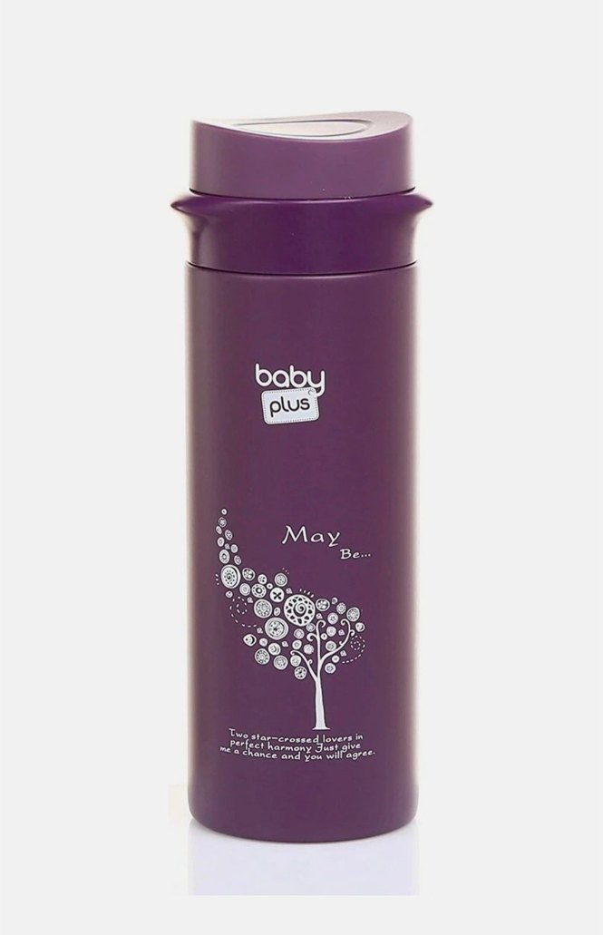 Mor renkli Baby Plus çocuk termos şişesi, güvenli kapak ve dekoratif ağaç deseni ile içecekleri sıcak tutar.