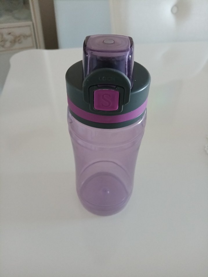 Mor renkli, kilitli kapağa sahip çocuk termos su şişesi. Hafif ve taşıması kolaydır.