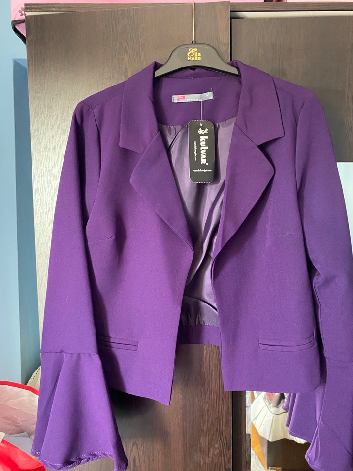 Mor renkli M beden crop ceket. Kolları volanlıdır. Sıfır ve etiketlidir.