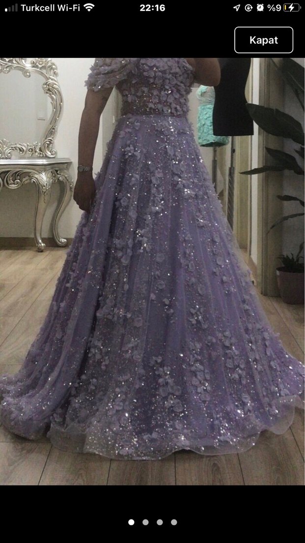 Mor renkte, çiçek desenli dantel işlemeli, straplez ve kolsuz uzun nişanlık.Özel dikimdir boy:164 kilo :60 5 cm topuklu ayakkabıyla giydim ama 10 cm e kadar giyebilirsiniz.