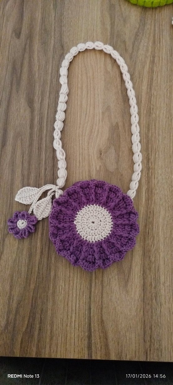 Mor ve krem renkli dantel çiçek detaylı, örgü askılı renkli bohem tarzda kız çantası.