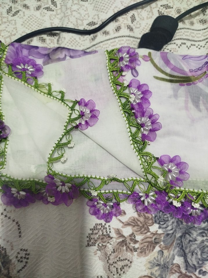 Yumuşak kumaştan, mor dantel detaylı ve çiçek işlemeli bohem tarzı kadın fular. Bohem ve retro stillerle uyumludur.