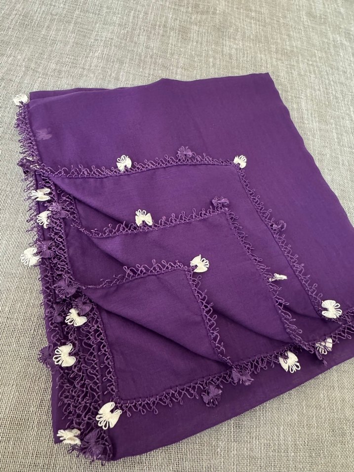 Koyu mor renkte, dantel detaylı tekstil kumaştan bohem ve retro tarzda kadın fular. Hippie ve alt kültür tarzını yansıtır.