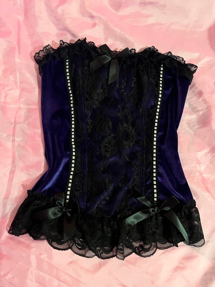 Mor renkli, straplez, nakışlı dantel detaylı ve saten fiyonklarla süslenmiş bustiyer. Sentetik kumaştan, gotik parti tarzına uygun dar kesim.
