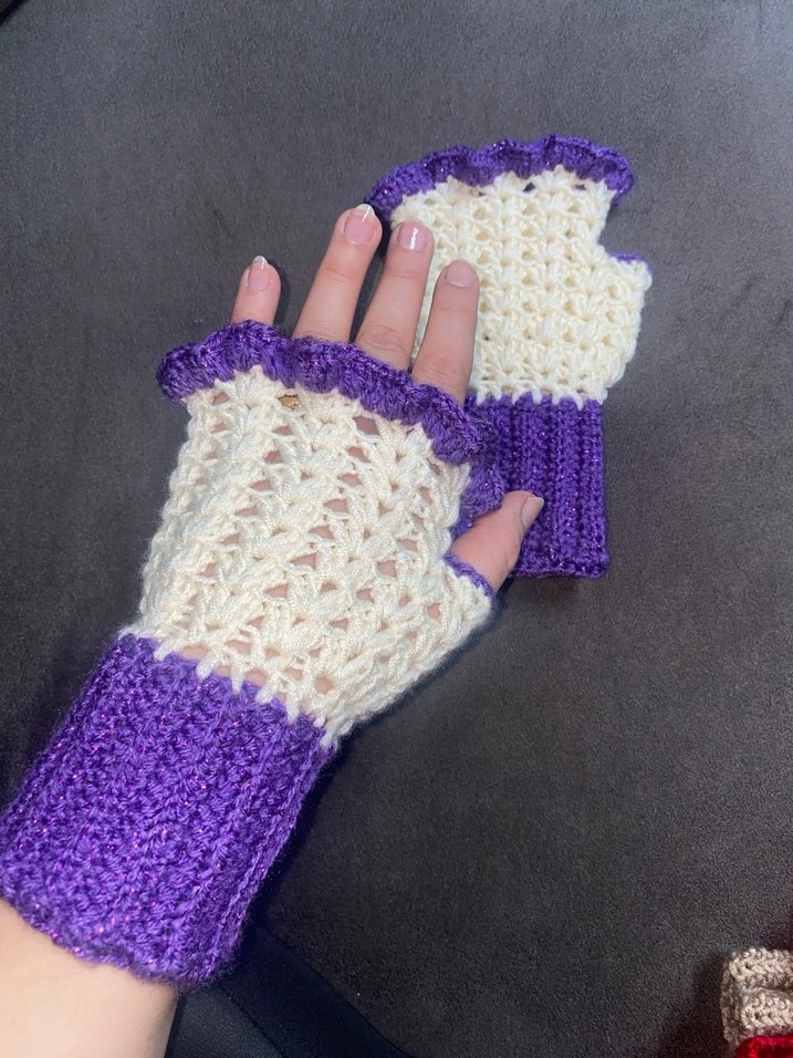 Hafif mor renkte, dantel detaylı ve parmakları açık örme kadın eldiveni, rahat ve vintage gotik tarzda.