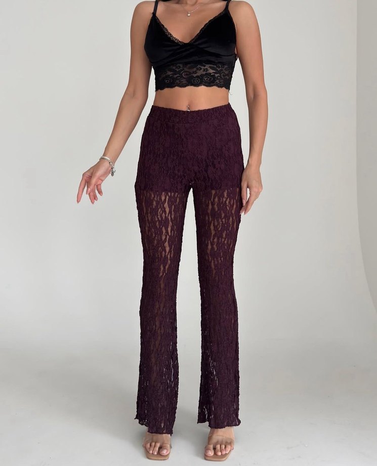 Beden mevcut Mor dantel detaylı, midi boy ve fitted kesim kadın pantolon. Yumuşak sentetik kumaştan, koyu tie-dye desenli, cesur ve gotik tarzda romantik akşamlara uygun.