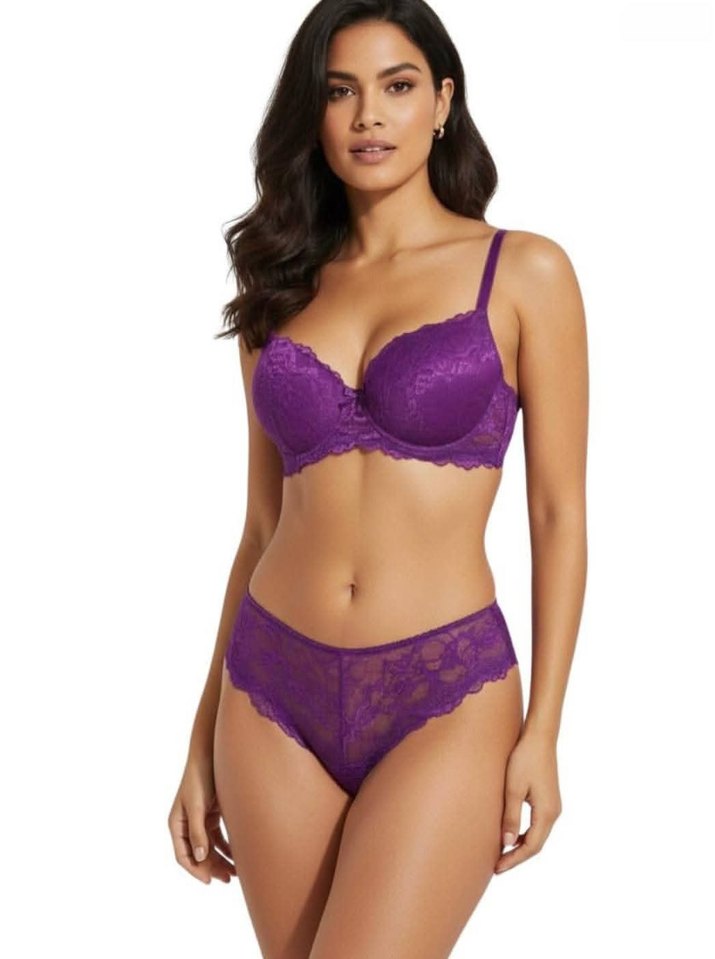 Mor renkte, dantel detaylı ve ayarlanabilir askılı, çağdaş tasarıma sahip gösterişli kadın sütyeni.