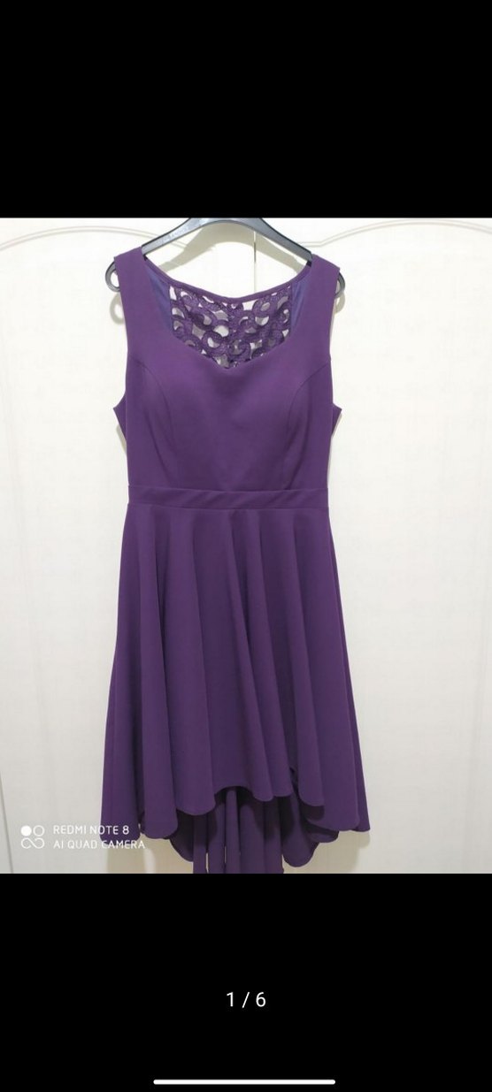 Kolsuz, V yakalı, dantel işlemeli mor abiye elbise. Modern klasik tarzda, midi boy ve hafif asimetrik etek kesimiyle parti için uygun.