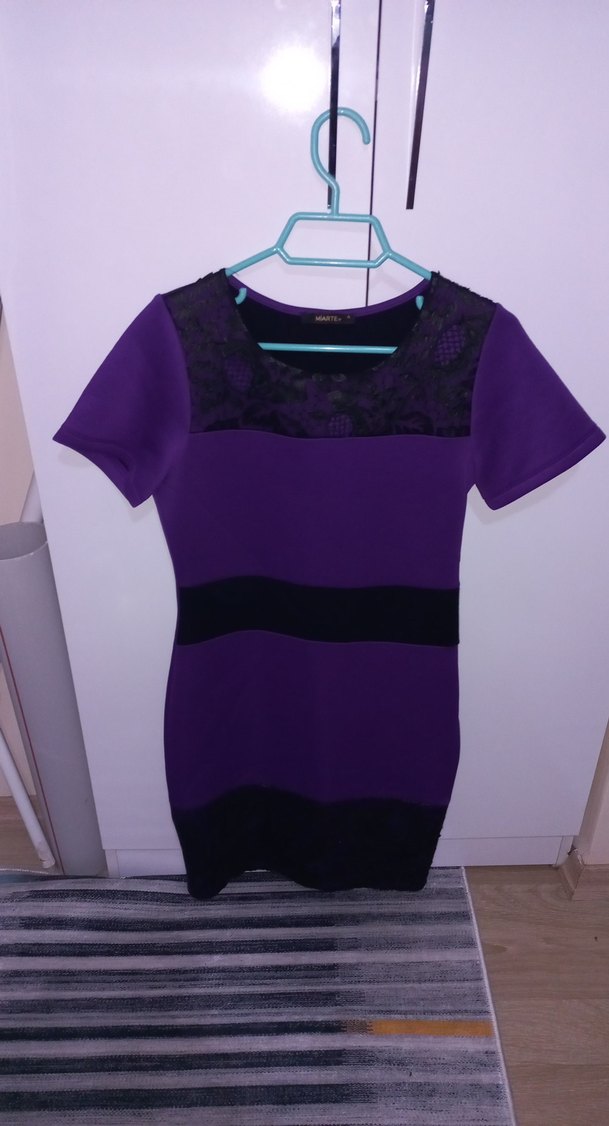 Mor renkli, dar kesim midi elbise, kısa kollu ve yuvarlak yaka, siyah dantel detaylarıyla gotik tarzda günlük kullanıma uygun.