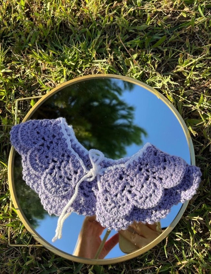 Yumuşak örgü kumaştan, dantel detaylı, bol kesim mor renk yakalık. Bohem tarzda