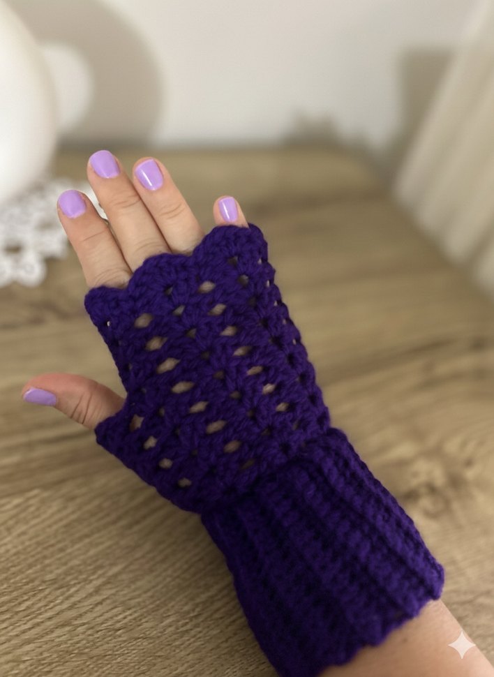 Mor renkli, dantel detaylı örme eldivenler. Parmaksız tasarımıyla bohem ve retro goth tarzına uygundur. Rahat ve renkli bir görünüm sunar.