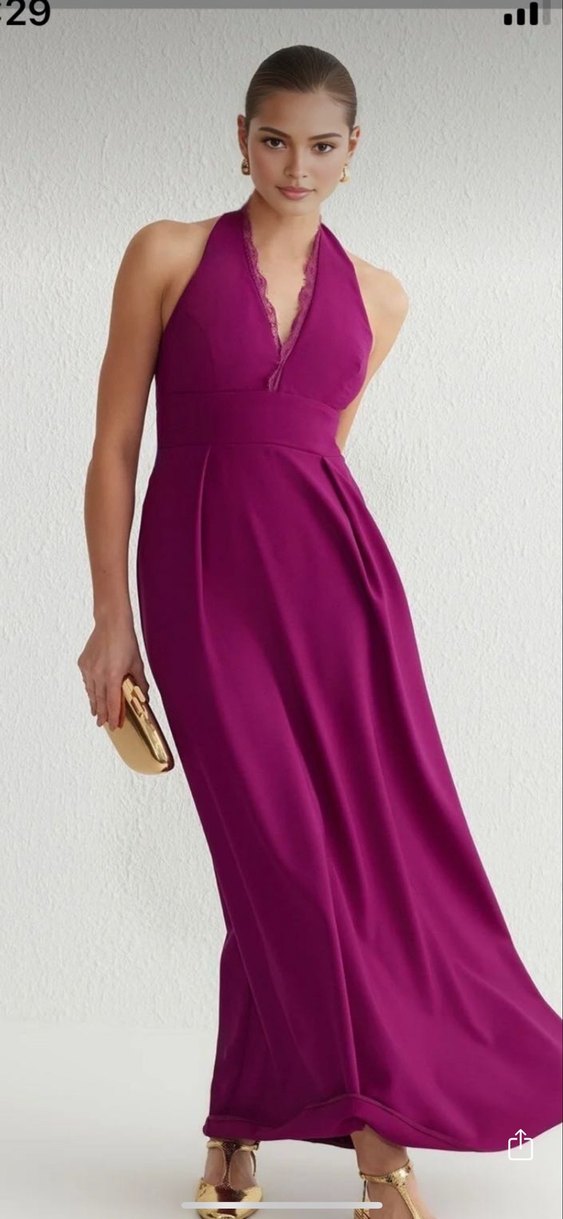 Mor parlak renkte, V yaka ve ince askılı, dantel detaylı uzun ve dar kesim abiye elbise. Düğün ve özel davetler için uygundur.