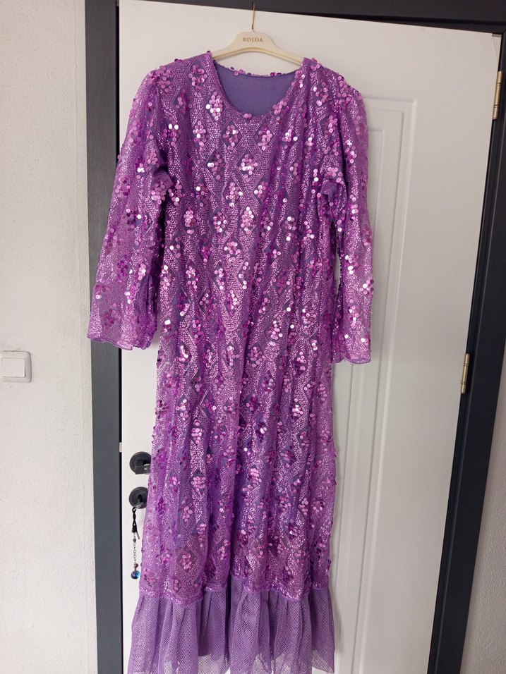 Mor renkte, uzun kollu, dantel detaylı ve bol kesim bohem tarzda uzun elbise. Renkli tie-dye deseni ve yuvarlak yaka ile düğün ve kına için uygun. kemerlidir özel dikimdir