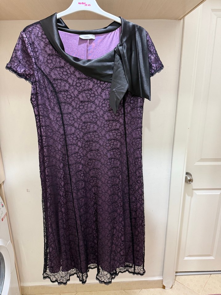 Mor ve siyah dantel detaylı uzun gotik elbise, kısa kollu ve bol kesimdir. Siyah saten fiyonk ve kayık yaka tasarımıyla romantik akşamlar için uygundur. 44-46 beden için uygundur. Bir kez giyilmiştir