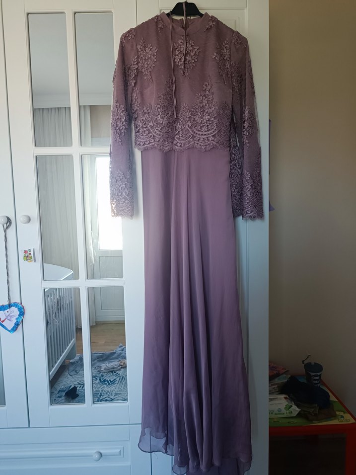 Mor Dantel Detaylı Uzun Kadın Abiye Elbise