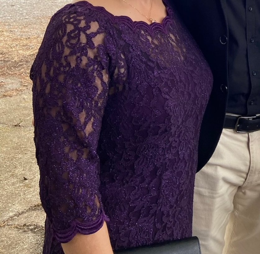 Mor renkte, dantel işlemeli, uzun kollu ve tekne yaka kesime sahip, klasik ve gotik tarzda, midi boyda şık bir elbisedir. Abiye bedeninde bedeni 50 dir aslında boy 1.57 kilo 62-68 arasına oluyor esniyor