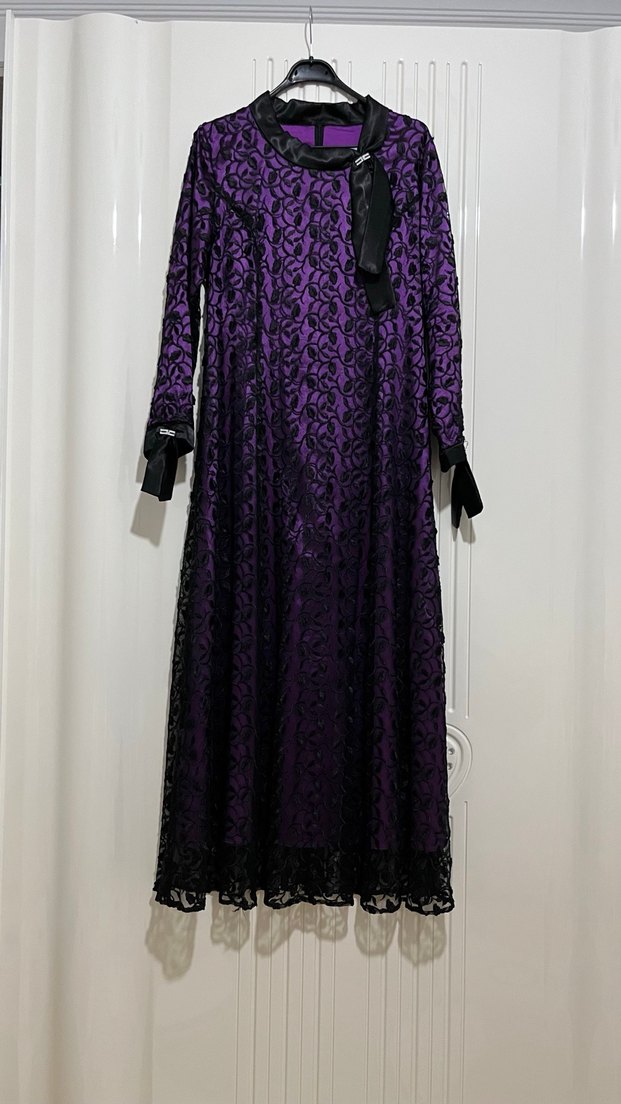 Mor renkli, dantel detaylı uzun elbise.bol kesim. Yakada ve kollarda şık detaylar bulunmakta. 42/44 beden özel dikim