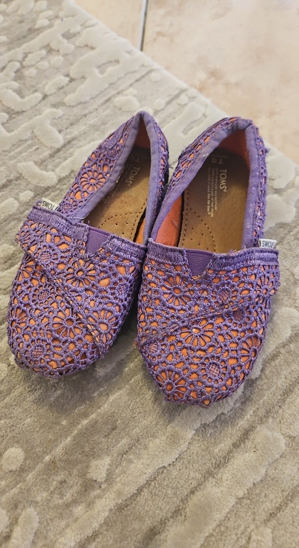 Mor pastel renkte, dantel işlemeli ve kauçuk tabanlı bohem tarzı kız babetleri.