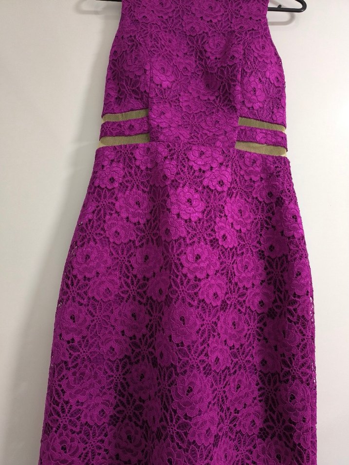Mor dantel ve işlemeli çiçek desenleriyle, yüksek yakalı, kolsuz, vücuda oturan midi elbise. Romantik akşamlar için ideal.