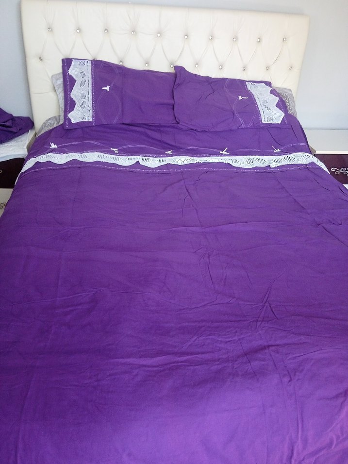 Mor renkli, parlak kumaştan yapılmış, işlemeli desenlere sahip nevresim takımıdır. Yastık kılıfları ile uyumludur. ️Lastiksiz dantel işlemeli çarşafı bulunur.