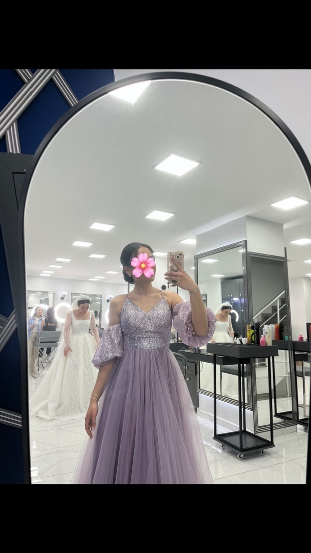 Bu açık mor nişan elbisesi, dantel detaylı oturan üst kısım ve straplez yaka ile öne çıkar. Uzun, bohem tarzda kolları baskılı desenlidir. Uzun boyu ile düğünler için uygundur.