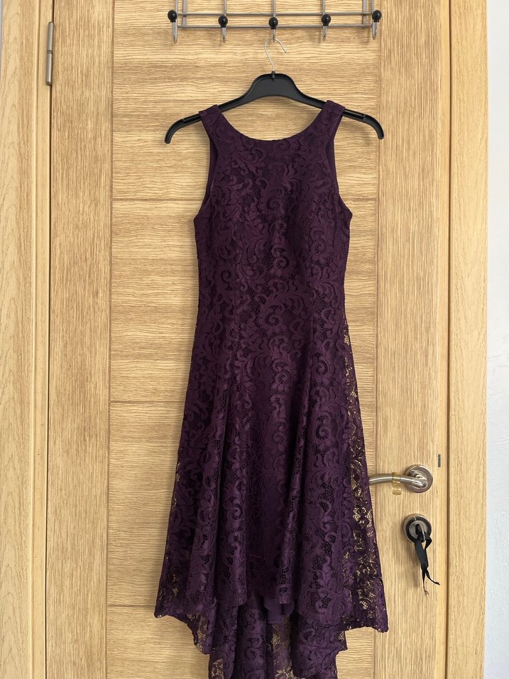 Mor renkte, dantel detaylı, kolsuz ve vücuda oturan midi uzunlukta kadın abiye elbise.