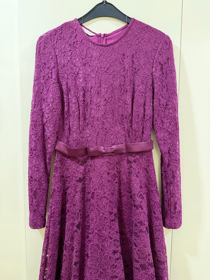 Fitted kesim, uzun kollu ve yuvarlak yaka mor dantel kumaştan kadın abiye elbise. Midi boy ve vintage esintili modern klasik stil, düğünler için uygun. Saten kemer şıklık katıyor.