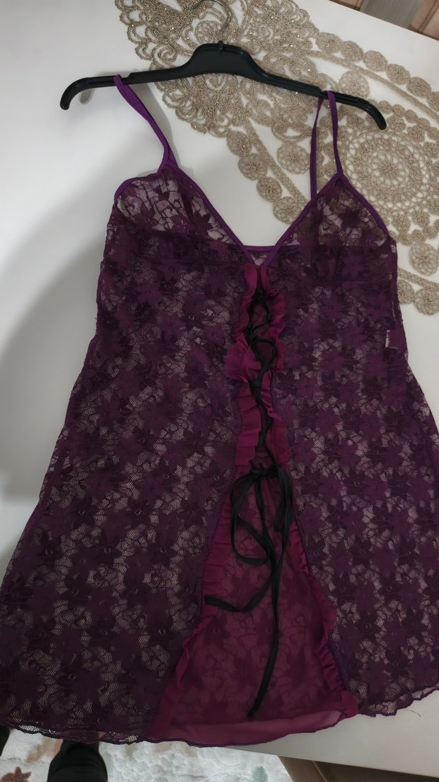 Mor dantel transparan midi gecelik, bol kesim ve ince askılarla. Bohem gotik tarzında, desensiz ve zarif bir görünüm sunar. marka temsilidir