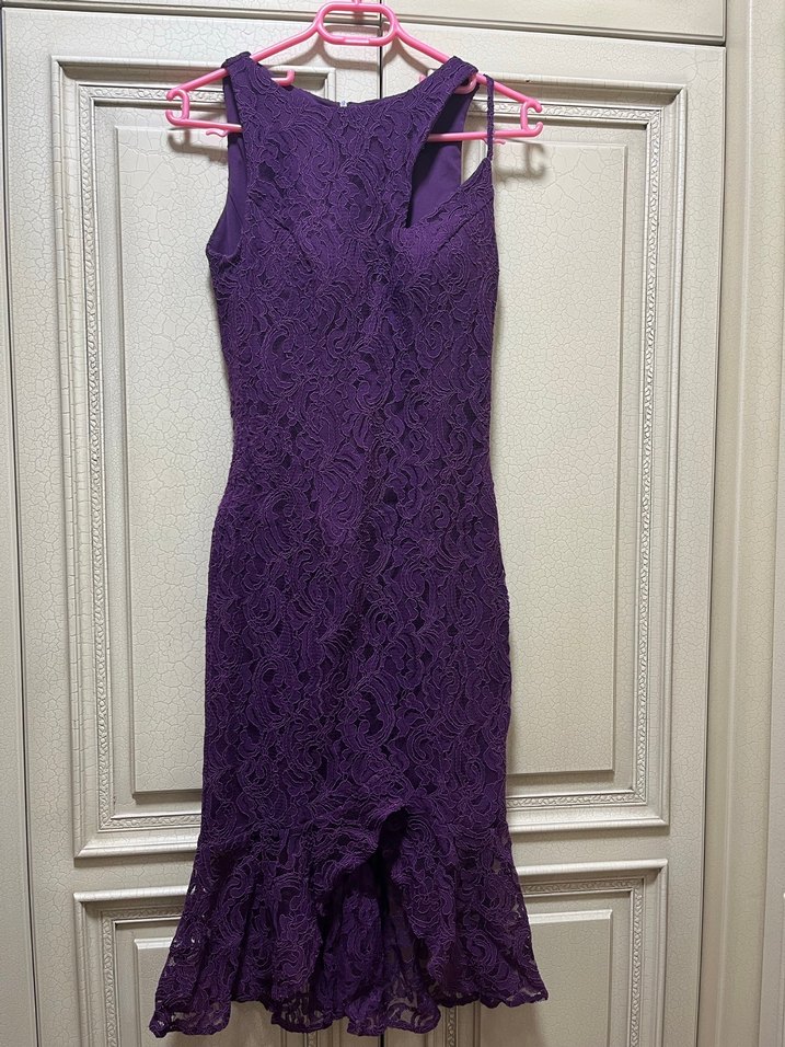 Kolsuz, ve uzun boy mor dantelden yapılmış bu dar kesim abiye elbise, 40 beden olmasına rağmen dar kesimdir