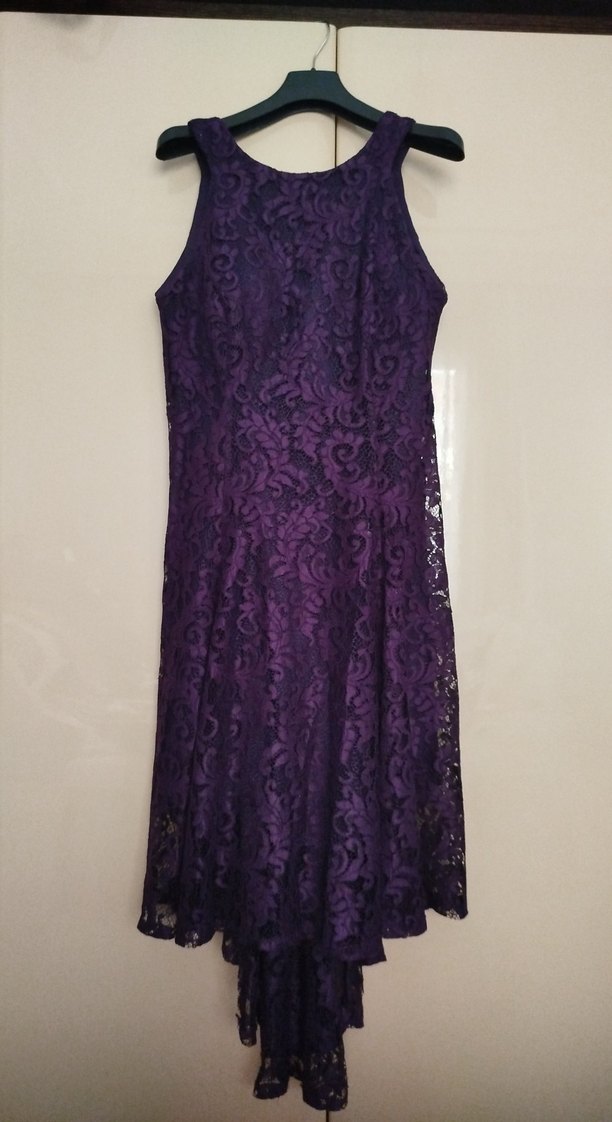 Mor dantel kumaştan yapılmış, kolsuz ve vücuda oturan uzun abiye elbise. Straplez yaka ve gotik stilde, düğün gibi özel günler için uygundur. ön boy 100 cm arka boy 110 cm arkadan fermuarlı içinden astarlı
