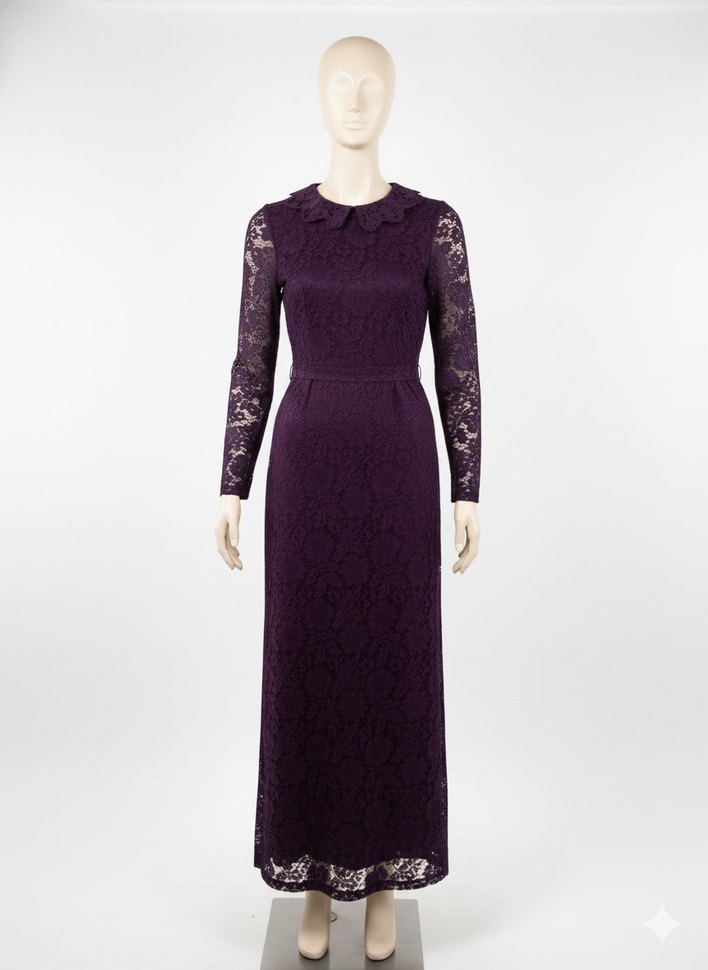 Mor dantel detaylı, uzun kollu, yuvarlak yakalı uzun elbise. Orta kalıp ve ipeksi dokuda, romantik akşamlar için uygun.