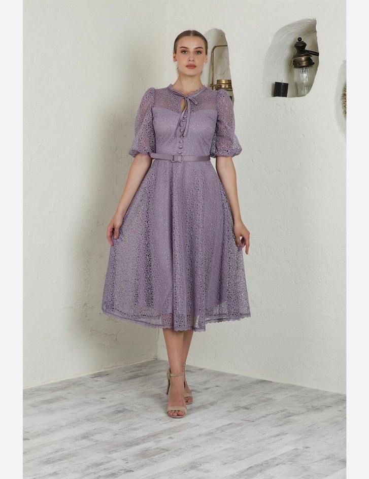 Mor renkte, dantel örme ve nakış detaylı, bol kesim uzun elbise. Balon kollu ve V yakalı, vintage bohem tarzını yansıtıyor. Günlük kullanıma uygun.