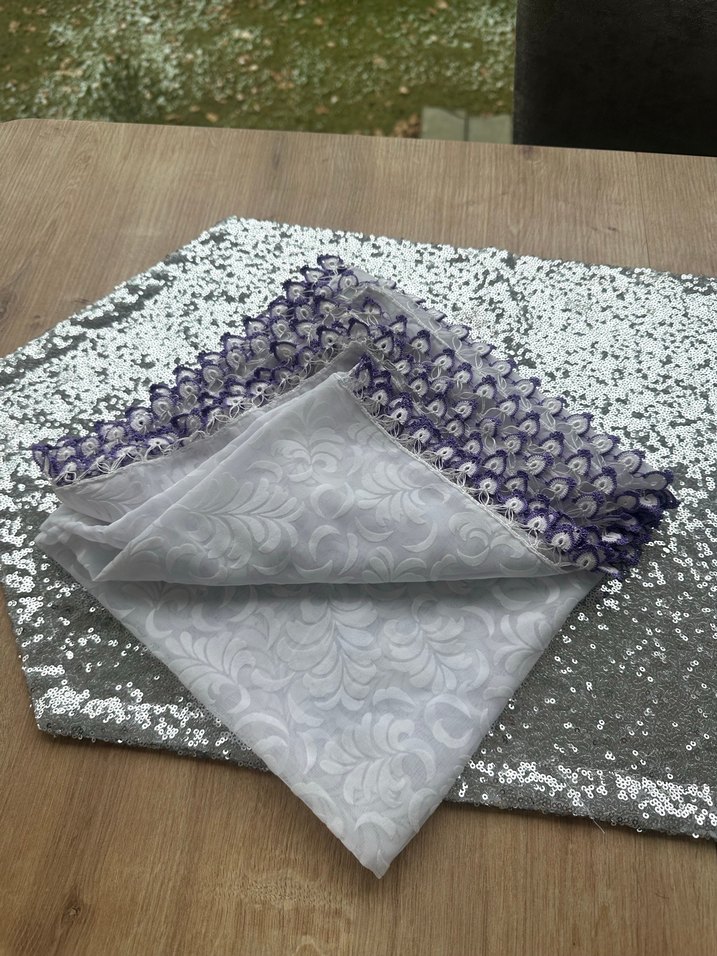 Yumuşak sentetik kumaştan yapılmış, mor dantel detaylı gri kadın şal. Modern, sade ve rahat bir tarz sunar. Namazlık beyaz örtü 4 tarafı el işi oyalıdır. Çeyizlik örtü arayanlar yada beyaz sevenler kullanabilir.