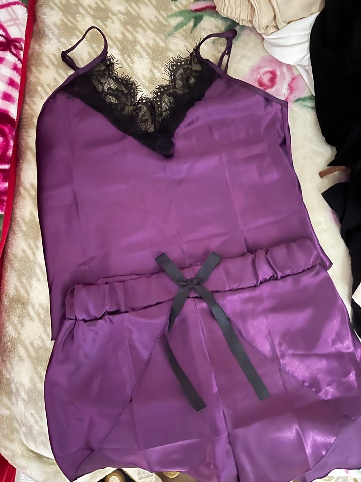 Koyu mor renkte, dantelli ip askılı üst ve kurdelalı şorttan oluşan, rahat ve ince dokulu kadın pijama takımı.