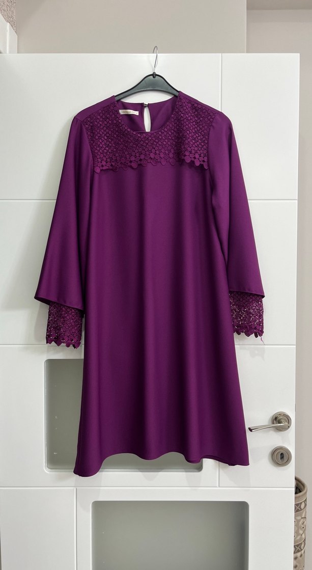 Mor renkli, dantelli ve işlemeli kadın tunik. Uzun kollu, yuvarlak yakalı, rahat kesim ve midi boydadır. Ofis için uygundur.