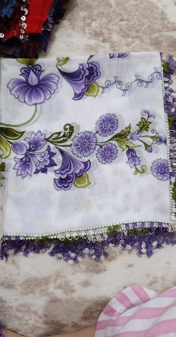 Mor çiçek desenli, yumuşak kumaştan yapılmış kadın fuları, ince dantel kenarlıklıdır. Bohem ve retro tarzına uygundur.