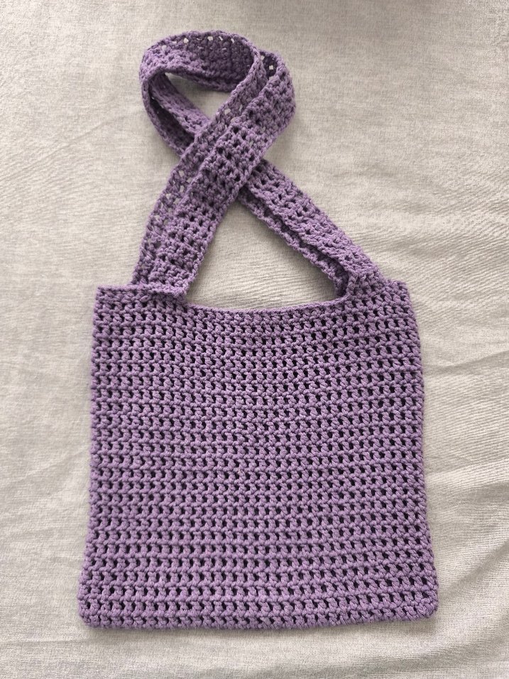 Mor renkli, dantelli örgü kadın çanta. Düz ve desensiz yapısıyla günlük kullanıma uygun, minimalist normcore tarzda.