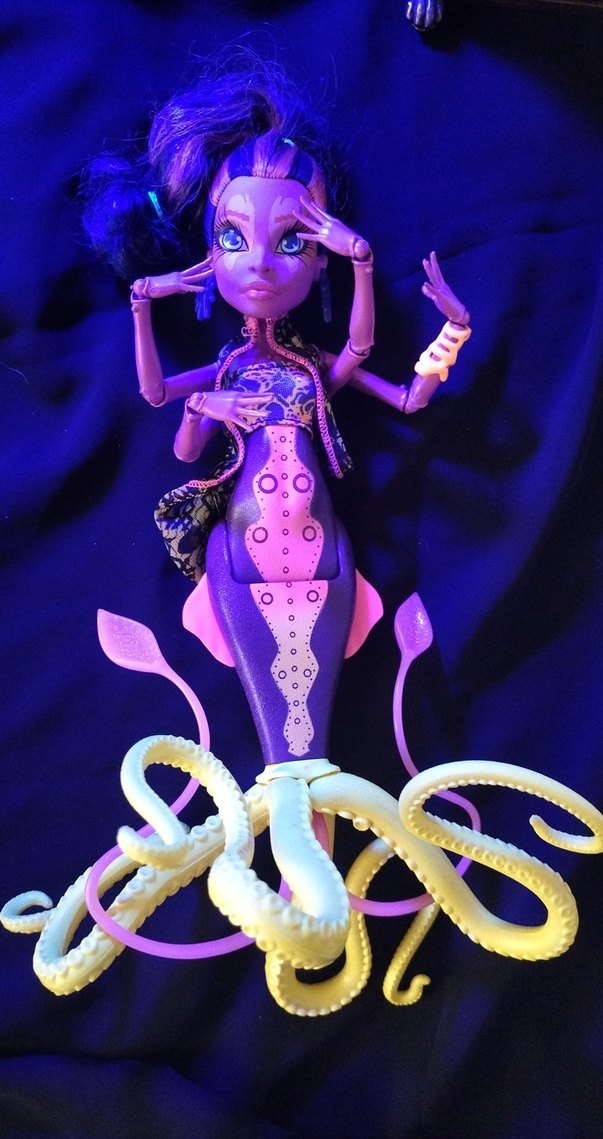 Mor renkte, hareketli kollara sahip ve ahtapot temalı tentaküllü alt bedenle deniz kızı tarzında bebek. Pazarlık yok Bebeklerin parçalarını ayrı satmıyorum ve standları orijinal değil, 3d stand.
