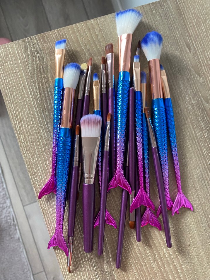 Mor saplı ve mavi uçlu kıllara sahip, denizkızı kuyruğu tasarımlı çeşitli makyaj fırçalarından oluşan set. Hic kullanmadigim boşta kaldiklari icin koyuyorum.
